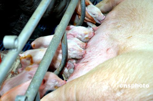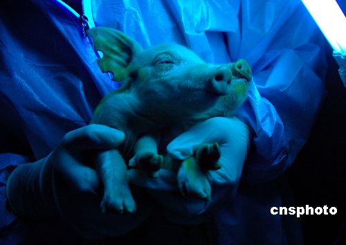 2008年1月7日12時,在哈爾濱三元畜產實業(yè)有限公司,11頭小豬順利降生,其中2頭表現(xiàn)出明顯綠色熒光蛋白特征。當日,東北農業(yè)大學傳出喜訊,由該校劉忠華教授主持的中國首例綠色熒光蛋白轉基因克隆豬當上“媽媽”,出生的11頭新生小豬其中有6頭為公豬,5頭為母豬,均健康活潑。中新社發(fā) 姚庭山 攝