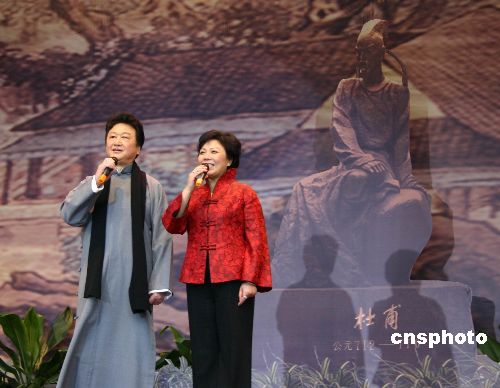 2月13日,中國農歷戌子年正月初七“人日”,在“詩圣”故居成都杜甫草堂詩圣文化園,數千名成都市民和各地游人聚精會神觀賞“人日游草堂”大型文藝演出,感受濃厚的詩情畫意。圖為著名配音表演藝術家喬榛、丁建華現場表演詩歌朗誦。中新社發 霍潺 攝