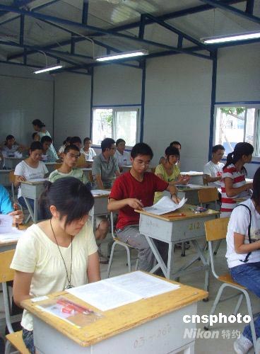 7月3日,四川地震災區9萬余名高三學生參加遲來的高考,圖為綿竹考點的學生在四川省工程職業技術學院新建的板房內參加高考。中新社發 霍潺 攝