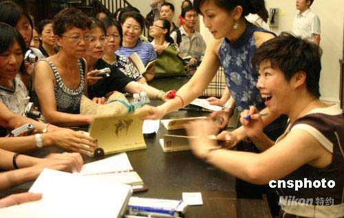 北京師范大學教授于丹20日在美國紐約哥倫比亞大學舉行講座,吸引數百“于丹迷”到場。圖為于丹講座結束后為“于丹迷”們簽名留念。中新社發 李靜 攝