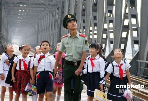 9月9日,開學伊始,又逢教師節,遼寧丹東邊防檢查站邀請駐地多所小學師生參觀中朝友誼橋,與邊防戰士一同描繪第二故鄉美景。中新社發 陳浩浩 攝