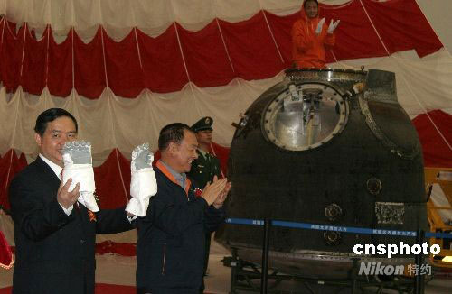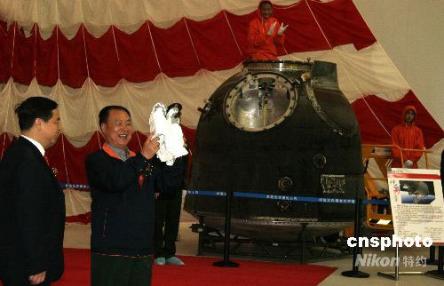 10月1日上午,神舟七號載人飛船返回艙在其誕生地——中國航天科技集團公司所屬中國空間技術(shù)研究院舉行開艙暨搭載物交接儀式,伴隨三位中國航天員太空飛行六十八小時二十七分鐘的一批特殊“乘客”一一精彩亮相,隨后各歸其主。圖為中國載人航天工程航天員系統(tǒng)總指揮兼總設(shè)計師、中國航天員科研訓(xùn)練中心主任陳善廣展示將由該中心珍藏、首次成功使用過的“飛天”艙外航天服手套。中新社發(fā) 孫自法 攝