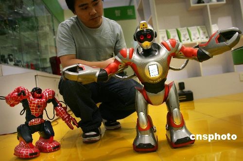 4月15日,北京首家機器人零售商店開業(yè)吸引顧客。該店位于中關(guān)村一電子商場內(nèi)。據(jù)該店羅經(jīng)理介紹,他們銷售的機器人有近百種,分為保潔型、娛樂型、教學(xué)型、家用型,價格從380元至58000元人民幣不等。保潔型機器人可每天定時清掃地面,自動躲避障礙物。娛樂型包括有機器人寵物、會跳舞的機器人等。教學(xué)型機器人一般用于高校計算機編程方面的教學(xué)。家用型機器人相對高端,臉龐分析系統(tǒng)可將陌生人的面容發(fā)送到主人手機上,具有“看家”功能,還能通過無線終端設(shè)備監(jiān)測家里老人的血壓脈搏等,發(fā)現(xiàn)問題會通知主人。中新社發(fā) 富田 攝