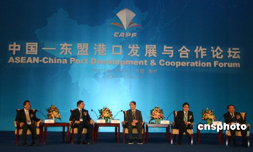 十月二十九日,新加坡萬邦集團董事長曹慰德、印尼BLT船務公司主席王景祺、泰國宏海箱運有限公司高級副總裁彭猜、深圳鹽田港董事長鄭京生以及中國海運集團公司副總裁張國華列席在廣西南寧舉行的“中國—東盟港口發展與合作論壇”,暢談港口合作。中新社發 王剛 攝