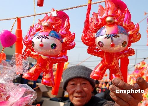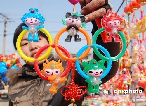 元宵節臨近,2月15日,在山東棗莊山亭區農村大集上,與奧運主題相關的居室飾品、時尚花燈等商品備受人們青睞,“奧運經濟”格外火爆。中新社發 劉明祥 攝