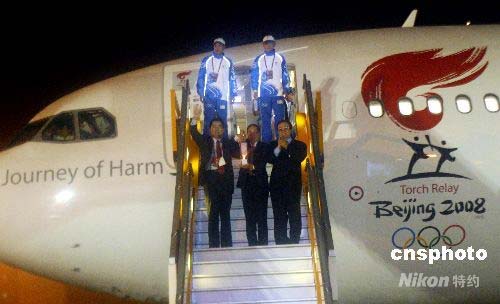 4月28日晚10時57分,載著北京奧運圣火的“奧運圣火號”抵達“和諧之旅”海外傳遞第十九站——越南的胡志明市。北京奧運圣火在胡志明市的傳遞將于29日晚6時開始,從位于該市中心的大劇院出發,經過多處著名地標后,抵達設在終點第七軍區體育館,全程長約十多公里。圖為北京奧組委執行副主席李炳華(中)手持圣火燈走下飛機。 中新社發 沈晨 攝