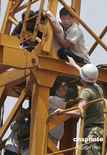 一名男青年因對父親在建筑工地猝死賠償不滿而爬上30多米高的塔吊頂端,身懸空中,意欲輕生。生死攸關之時,消防官兵經過兩個多小時的巧妙周旋和艱難營救,男青年被安全救回地面。 中新社發 張曉理 攝