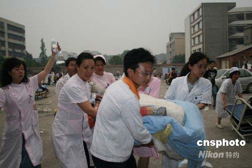 5月12日下午,四川汶川縣發生了7.8級地震。與之相鄰的四川眉山市也發生了5—5.5級地震。眉山市第二人民醫院醫務人員自發投入避震救災工作,各科有序地將病員疏散到停車場內,并分科集中繼續對危重病人進行治療。醫院還調用兩輛救護車作為臨時手術室對急診手術病人實施緊急手術治療,其中一產婦在臨時手術室順利產下了孩子。中新社發 堯遙 攝