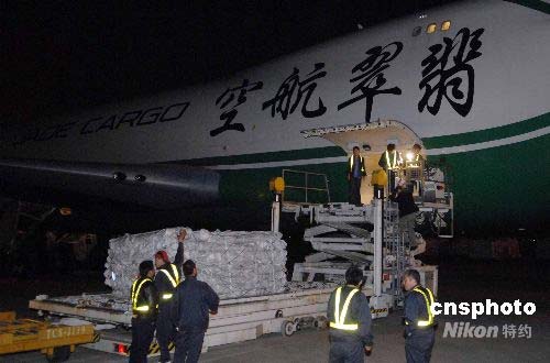 五月十三日深夜,深圳航空旗下的中德合資翡翠航空大型貨機(jī)JI7452受命緊急運(yùn)輸救災(zāi)物資,四千頂帳篷從天津?yàn)I海機(jī)場連夜裝機(jī)起運(yùn),專機(jī)運(yùn)往四川地震災(zāi)區(qū)。中新社發(fā) 陳文 攝