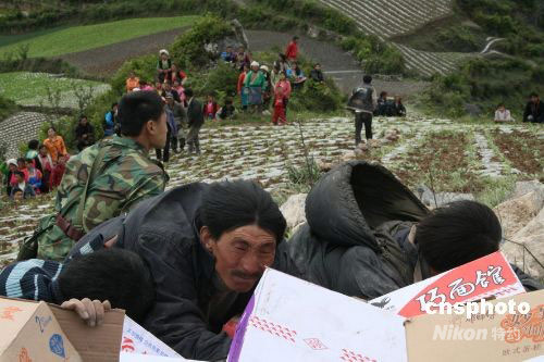5月14日,成都軍區某陸航團四架直升機滿載帳篷、礦泉水等災區急需物資抵達四川大地震震中汶川縣。這是災后第一次成功降落到汶川災區的飛機。圖為災民在直升機旁守護救災物資。 中新社發 張雷 黃龍 攝