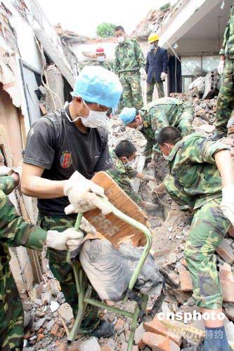 5月14日,成都軍區(qū)某特種大隊(duì)?wèi)?zhàn)士在清理地震廢墟現(xiàn)場(chǎng)。