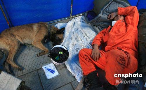 搜救員和搜救犬極度疲勞。中新社發 周青先 攝