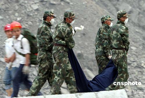 通往四川省汶川地震核心重災區映秀鎮的簡易公路5月17日打通后,各路專業救援隊繼續在廢墟中尋找可能的幸存者,部分解放軍與武警士兵則負責安置遇難者的遺體,以防止發生疫情。中新社發 任晨鳴 攝