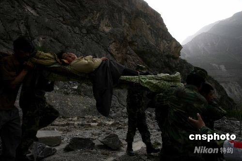 成都軍區駐渝某集團軍紅軍師步兵團翻山越嶺解救汶川大地震茂縣羌寨兩位女傷員,傍晚成功送到前來支援的解放軍第二軍醫大學醫療隊。中新社發 賈國榮 攝