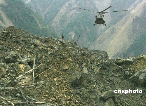 五月二十日上午十時,成都軍區陸航團姜廣偉王牌直升機組以單輪成功強降北川重災區“定時炸彈”--堰塞湖無名塌方小土堆上。中新社發 賈國榮 攝