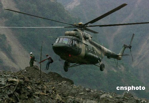 五月二十日上午十時,成都軍區陸航團姜廣偉王牌直升機組成功強降北川重災區“定時炸彈”--堰塞湖無名塌方小土堆上,水利地質技術人員緊急跳下飛機,投入實地監測水位。 中新社發 賈國榮 攝