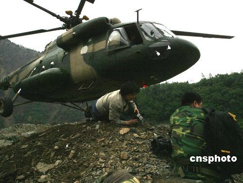 五月二十日上午十時,中新社與中央電視臺四名記者乘成都軍區陸航團姜廣偉王牌直升機,強降北川重災區“定時炸彈”--堰塞湖無名塌方小土堆上,進行報道。中新社發 賈國榮 攝
