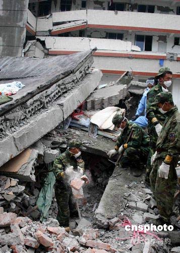 5月22日,鐵軍官兵繼續對汶川縣映秀鎮進行拉網式搜尋。中新社發 曾憲平 攝