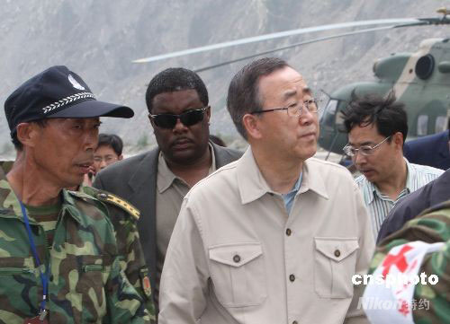 聯合國秘書長潘基文在映秀鎮察看地震災情