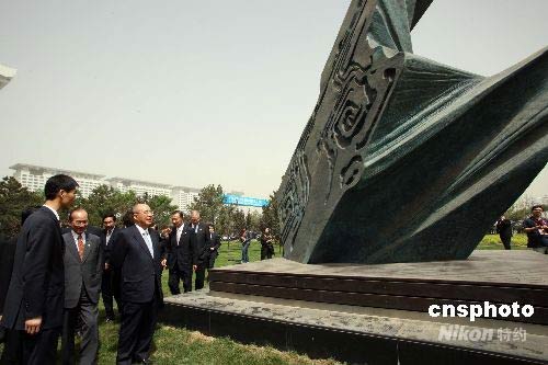 5月28日,中國國民黨主席吳伯雄一行前往北京奧林匹克中心區,參觀臺灣藝術家楊英風的雕塑作品“水袖”。中新社發 盛佳鵬 攝