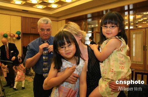 圖為從湖南被收養(yǎng)的雙胞胎姐妹Nina和May與父母在一起。