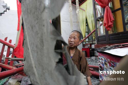 6月4日,四川綿竹漢旺鎮云霧寺的尼姑,回到被地震毀壞的寺廟,看到滿目瘡痍的景象頗為無奈。中新社發 慎重 攝