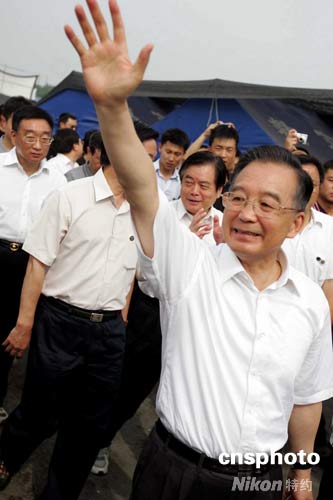 6月6日,國務院總理溫家寶到四川綿陽涪城區疏散安置點慰問受災民眾。 中新社發 杜洋 攝