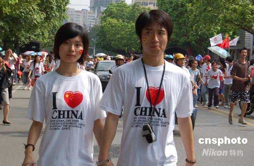 一對年輕情侶牽手街頭迎接奧運圣火。中新社發 劉萬強 攝