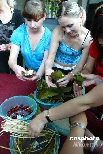 圖:端午節(jié)外國賓客學(xué)包中國粽子