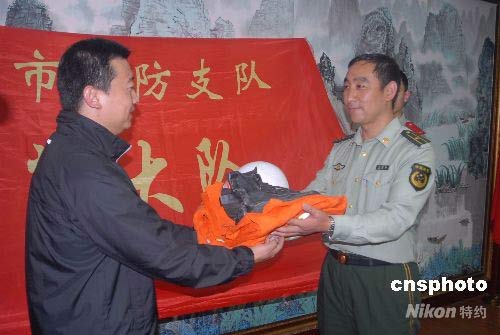 6月9日,中國(guó)國(guó)家博物館在沈陽(yáng)消防支隊(duì)舉行了抗震救災(zāi)相關(guān)實(shí)物和資料收藏的交接儀式,四川抗震救災(zāi)中沈陽(yáng)消防支隊(duì)特勤大隊(duì)隊(duì)旗、大隊(duì)長(zhǎng)李忠海的防護(hù)服(含頭盔)和隊(duì)員的戰(zhàn)地日記等成為了中國(guó)國(guó)家博物館永久性收藏品。這是中國(guó)國(guó)家博物館首次收藏四川抗震救災(zāi)實(shí)物和資料。在四川抗震救災(zāi)中,沈陽(yáng)市消防局特勤大隊(duì)是中國(guó)第一支進(jìn)入北川縣的救援隊(duì)。中新社發(fā) 沈警 攝