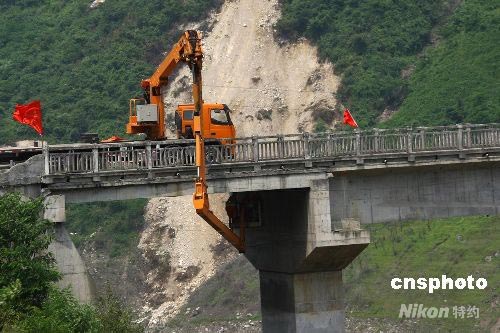 6月10日中午,四川某勘測設計院抓緊時間,冒著酷暑,在通往映秀鎮的壽江大橋下勘測橋墩受損情況。中新社發 譚超 攝