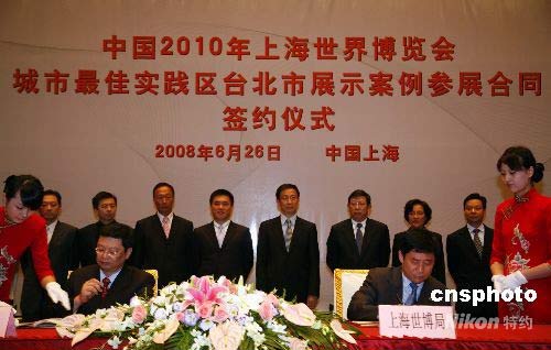 6月26日晚,臺(tái)北市簽約參展二0一0年上海世博會(huì),臺(tái)北案例參展總協(xié)調(diào)人脫宗華代表臺(tái)北市與上海世博局洪浩局長(zhǎng),在上海西郊賓館簽署參展合同,臺(tái)北市市長(zhǎng)郝龍斌、上海市市長(zhǎng)韓正、上海市副市長(zhǎng)楊雄、鴻海科技集團(tuán)暨富士康科技集團(tuán)董事長(zhǎng)郭臺(tái)銘等作為簽約見(jiàn)證人,出席簽約儀式。中新社發(fā) 潘索菲 攝