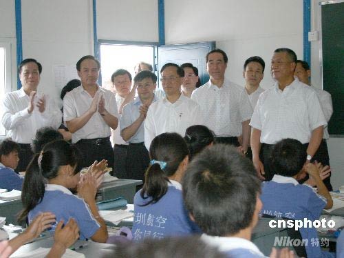 圖:曾蔭權何厚鏵看望災區臨時學校學生