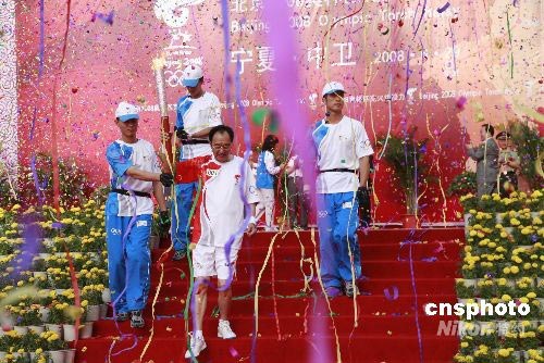 中衛市是奧運火炬在寧夏傳遞第一站,火炬手共有205名,第一棒火炬手是寧夏文聯名譽主席、知名作家張賢亮。張賢亮開辦了鎮北堡西部影視城并成功經營,號稱中國作家“首富”。 中新社發 蘆河 攝
