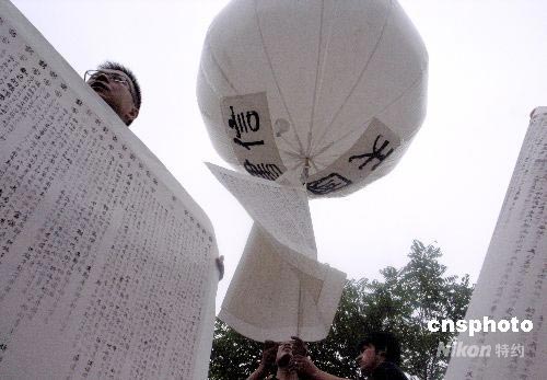6月29日下午2點(diǎn)28分,北京藝術(shù)家朱永靈在北京798藝術(shù)區(qū)為四川地震遇難者放飛“天國(guó)書信”。這些書信摘抄自汶川大地震紀(jì)念館網(wǎng)站上網(wǎng)民為地震遇難者所寫的留言。中新社發(fā) 廖攀 攝