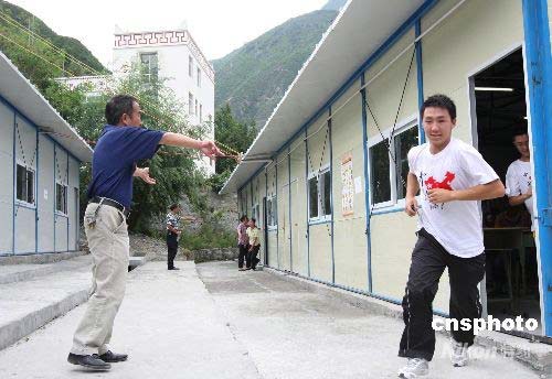 理縣中學高考考點的監考老師正在指揮學生進行余震緊急疏散演習。中新社發 黃榮 攝