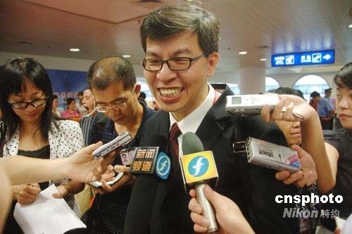 搭乘赴臺旅游福建首發團暨周未包機從廈門到松山的臺灣中國時報旅行社游學中心總經理趙政岷先生,在廈門高崎機場接受媒體采訪時,對兩岸交流廣闊前景充滿信心。中新社發 鄭祚聲 攝