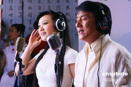 7月7日,國際巨星成龍與著名歌唱家譚晶在北京攜手錄制北京2008奧林匹克公園中心區文化展示活動“中國故事”的主題歌《中國看見》。中新社發 李慧 攝