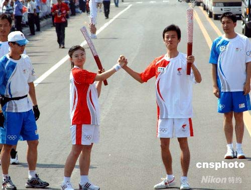 7月9日,奧運火炬在內蒙古鄂爾多斯進行傳遞。圖為火炬手黃逸捷、朱小芳正在交接火炬。中新社發 廖攀 攝
