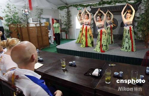 7月29日,在北京奧運村的中國茶館里,剛剛訓練完的英國跳水隊在這里品茶休息。奧運村里完善的設施處處體現(xiàn)著濃濃的中國風情。中新社發(fā) 杜洋 攝