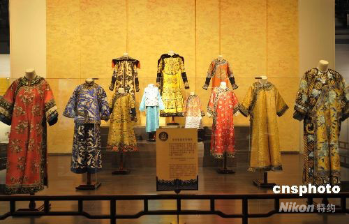 8月21日,北京故宮博物院的午門城樓展廳向游客展示了真品清朝皇家服飾,103件“天朝衣冠”集體亮相。本次展覽蘊納著深邃而多元的中國清代文化內涵,講述著文明古國中國,賦予衣冠以明禮儀,辨尊卑的政治功能。圖為中國清代皇帝家庭著裝場景。中新社發 王宇婷 攝