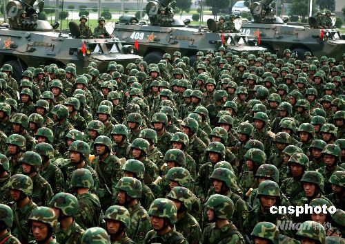 中國人民解放軍“礪兵--2008”演練8月26日拉開帷幕。當日下午濟南軍區某機械化步兵旅參戰部隊,火速集結,進入緊張戰備狀態。解放軍濟南軍區這支機械化步兵部隊與北京軍區一支數字化部隊舉行的這次跨軍區聯合實兵對抗演練,是雙方在為期一個月內進行現代條件下“背靠背”的立體化攻防演練,攻擊與反殲雙方將根據作戰任務和“情報”實施作戰計劃,以磨練部隊的戰斗能力。中新社發 宋吉河 攝