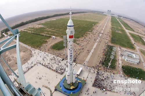 備受矚目的神舟七號載人航天飛行任務(wù)實施在即,目前,神舟七號船、箭、塔組合體已順利垂直轉(zhuǎn)運(yùn)至中國載人航天發(fā)射場發(fā)射架,整裝待發(fā)。中新社發(fā) 楊志遠(yuǎn) 攝