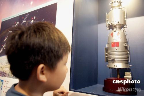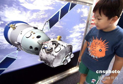 九月二十四日,一位小朋友被“神舟七號——中國首次太空漫步”展上的神舟太空船宣傳畫所吸引。當日起,香港太空館舉行相關展覽,讓市民加深對神舟七號、以及中國載人航天科技發展的認識。中新社發 張勤 攝