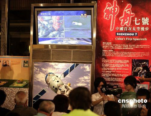 九月二十五日晚,香港市民在太空館觀看“神舟七號”升空直播。中新社發 張勤 攝