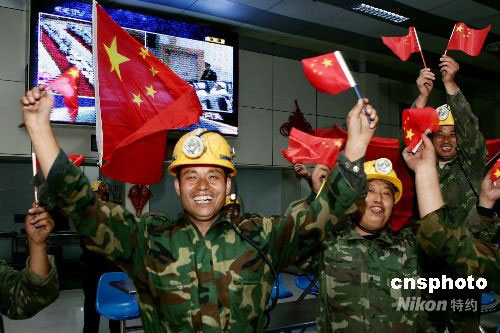 9月25日晚,安徽淮北安徽恒源煤電公司的礦工們揮舞國旗歡呼“神七”發射成功。當日,該公司上千名礦工收看了神舟七號飛船發射的電視直播。中新社發 黃啟軍 攝