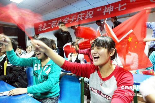 9月25日晚,安徽省淮北市二職高的學生在收看“神七”發射的現場直播。當晚,我國第三艘載人航天飛船——神舟七號飛船的升空牽動了億萬中國人的心。中新社發 李博 攝