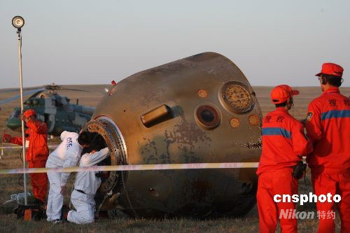 9月28日晚,神七返回艙成功著陸,航天員依次出艙。中新社發 張雷 攝
