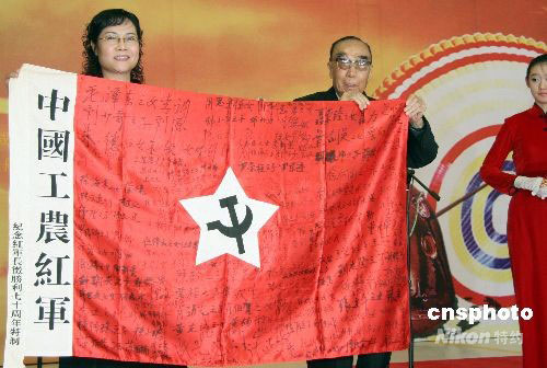 10月1日上午,神舟七號載人飛船返回艙在其誕生地——中國航天科技集團公司所屬中國空間技術研究院舉行開艙暨搭載物交接儀式,伴隨三位中國航天員太空飛行六十八小時二十七分鐘的一批特殊“乘客”一一精彩亮相,隨后各歸其主。圖為新中國首任駐美大使柴澤民(中)現場移交并展示隨“神七”飛天的中國工農紅軍軍旗。中新社發 孫自法 攝