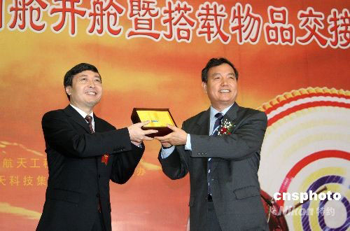 10月1日上午,神舟七號載人飛船返回艙在其誕生地——中國航天科技集團公司所屬中國空間技術研究院舉行開艙暨搭載物交接儀式,伴隨三位中國航天員太空飛行六十八小時二十七分鐘的一批特殊“乘客”一一精彩亮相,隨后各歸其主。圖為中國載人航天工程辦公室主任王文寶(右)福建省有關方面移交錄有海峽兩岸民眾祝福語音并隨“神七”飛天的U盤。中新社發 孫自法 攝